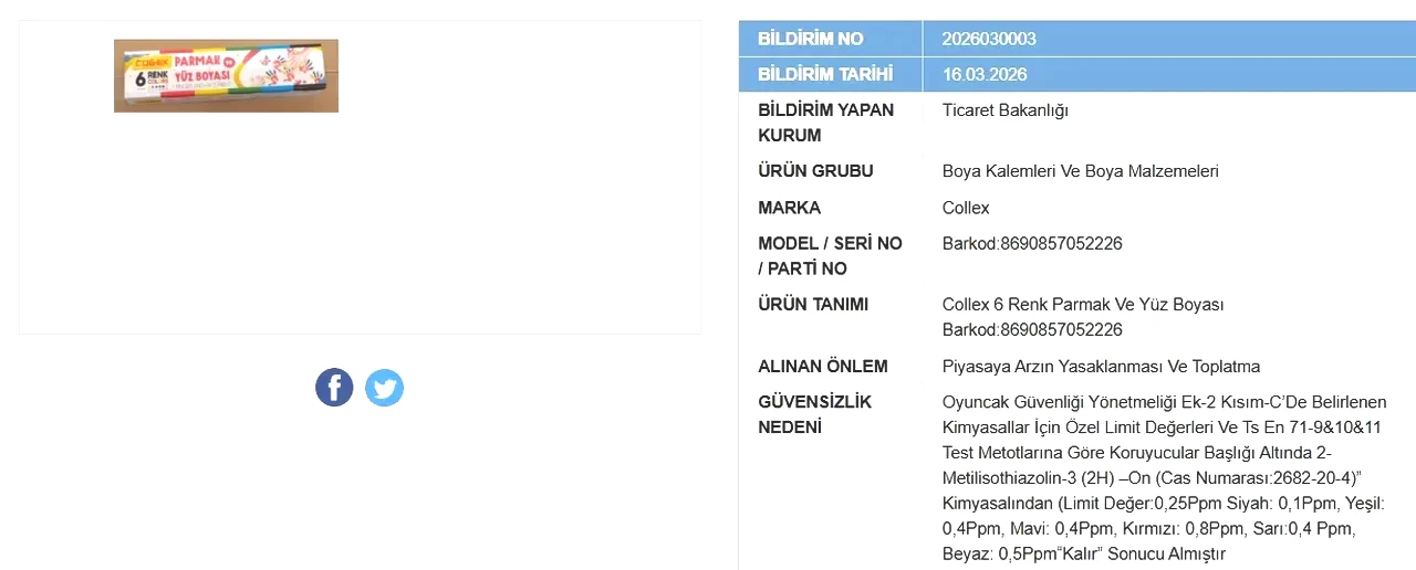 Bakanlık, 16 Mart tarihli en son açıklamasında dikkat çekici bir ürünü daha listeye ekledi. “Collex” markasına ait “6 renk parmak ve yüz boyası”nın satışı yasaklandı ve bu ürünün piyasadan toplanmasına karar verildiği duyuruldu.